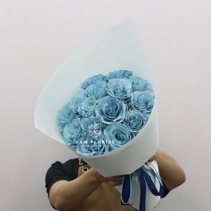Bó hoa nhập khẩu tone xanh dương gây ấn tượng ngay từ ánh nhìn đầu tiên với sắc xanh pastel dịu nhẹ, hiếm có và đầy cuốn hút. Những đóa hoa được xử lý màu tinh tế, cánh hoa xoáy tròn hoàn hảo, form bông to đều và dày cánh, tạo nên tổng thể mềm mại nhưng vẫn rất sang trọng.