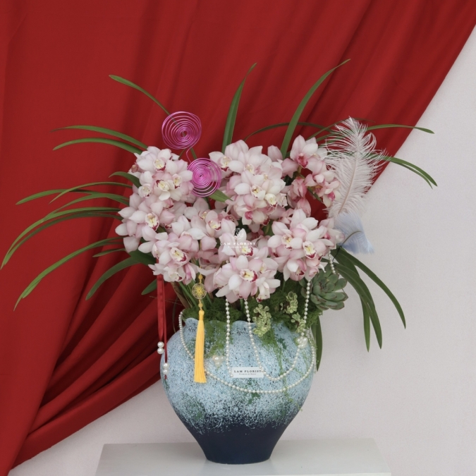 Bình Địa Lan Cát Phúc Xuân gây ấn tượng với những chùm địa lan hồng phấn nở dày, cánh hoa tròn đầy, sắc hồng dịu nhẹ pha trắng kem tạo cảm giác sang trọng và ấm áp. Dáng hoa tỏa đều, kết hợp cùng lá xanh vươn dài mềm mại, mang vẻ đẹp phồn thịnh nhưng vẫn rất thanh nhã.