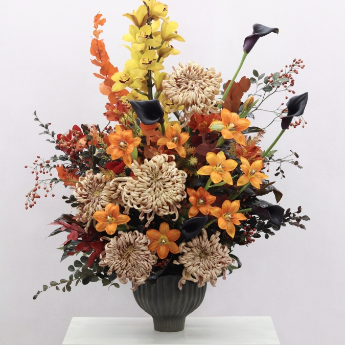 Những đóa tulip cam tươi tắn cùng cúc Venaa form lớn được bố trí hài hòa, tạo nên một bố cục nhiều tầng lớp, vừa mềm mại vừa mạnh mẽ. Tông màu cam – vàng – nâu trầm gợi cảm giác ấm áp, sang trọng, rất phù hợp với không gian cao cấp hoặc dịp đặc biệt.