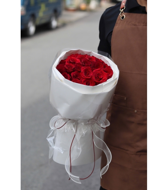 Bó hoa được thiết kế theo dáng tròn truyền thống, sử dụng những bông hồng Ecuador đỏ nổi tiếng với cánh dày, màu sắc rực rỡ và độ bền vượt trội. Các bông hoa được xếp khít, tạo thành một mặt tròn đầy đặn, mềm mại nhưng vô cùng sang trọng. Lớp giấy gói trắng phối cùng một chút voan trong suốt, điểm bằng ruy-băng đỏ – trắng tạo nên vẻ đẹp tinh tế, thanh lịch và hiện đại. Tổng thể bó hoa toát lên sự chỉn chu, đẳng cấp và phù hợp cho mọi dịp quan trọng.