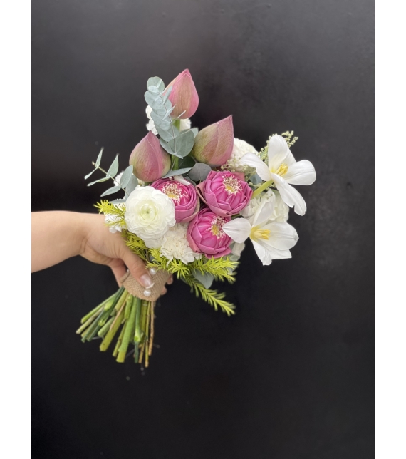 • Bó cưới “Hồng Sen Dịu Ái” là sự kết hợp hài hòa giữa nét truyền thống Á Đông và vẻ hiện đại phương Tây. Màu hồng sen thanh tú hòa quyện cùng sắc trắng tinh khôi của tulip và ranunculus, tạo nên một tổng thể mềm mại, trong trẻo và đầy lãng mạn.