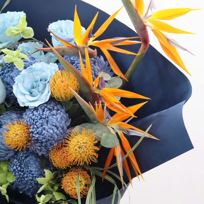 Bó hoa là sự kết hợp ấn tượng giữa tone xanh – cam đầy cá tính, nổi bật với những đóa hồng sky blue nhập khẩumang sắc xanh độc đáo, kết hợp cùng hoa thiên điểu vươn cao mạnh mẽ như biểu tượng của khát vọng.