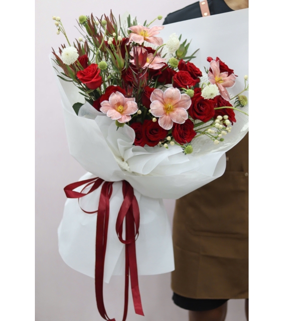 Bó hoa là sự kết hợp tinh tế giữa nhiều loài hoa cao cấp: tulip Nam Phi mềm mại, hồng Ecuador đỏ sang trọng, chuỗi ngọc trắng tinh khôi, tulip nâu Hà Lan độc đáo cùng các nhánh thuý châu điểm xuyết nhẹ nhàng. Các tông màu đỏ – hồng – nâu – trắng hòa quyện tạo nên vẻ đẹp vừa hiện đại vừa lãng mạn. Lớp giấy gói trắng kết hợp ruy-băng đỏ nổi bật giúp tổng thể trở nên thanh lịch, trang nhã nhưng vẫn đầy khí chất. Đây là bó hoa dành cho những ai yêu thích sự tinh tế, khác biệt và đậm chất nghệ thuật.