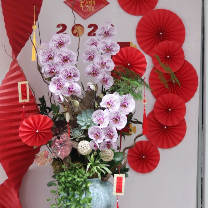 Chậu lan thích hợp trưng bày tại phòng khách, sảnh công ty, lễ tân, showroom hoặc làm quà biếu Tết sang trọng, ý nghĩa.