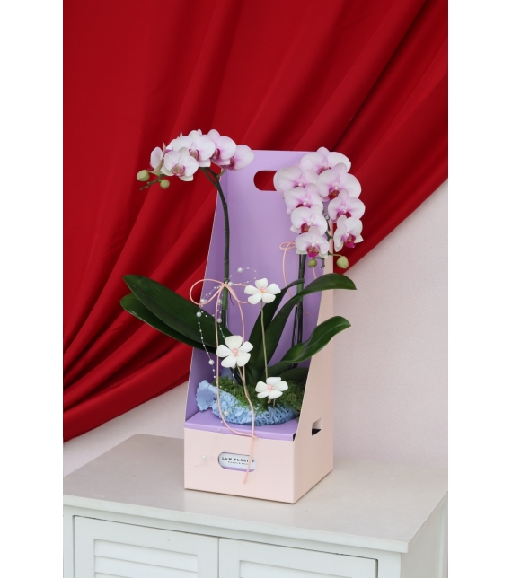 Chậu Lan Ngọc An Xuân Mini thu hút ánh nhìn bởi sắc lan hồ điệp trắng phớt hồng tinh khôi, cánh hoa tròn đầy, nhụy hồng nổi bật tạo cảm giác nhẹ nhàng nhưng rất sang trọng. Hai cành lan uốn cong mềm mại, bố cục cân đối, mang nét thanh lịch và trang nhã cho không gian Tết.