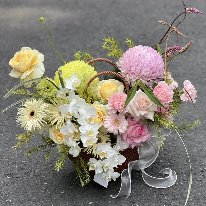 Hoa được cắm trong giỏ mây nâu cổ điển, vừa thanh lịch vừa gần gũi, phù hợp làm quà tặng doanh nhân, đối tác, người thân hoặc người yêu trong những dịp tri ân, khởi đầu mới, hoặc chúc mừng thành công.