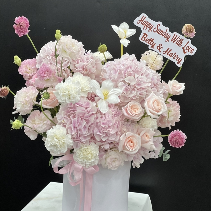 • Hộp hoa được phối theo tông hồng pastel nhẹ nhàng kết hợp trắng tinh khôi, mang đến cảm giác vừa sang trọng vừa trong trẻo.
