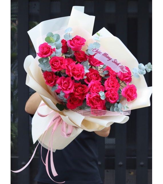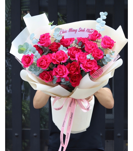 • Bó  hoa nổi bật với những đóa hoa hồng Pink Loy Việt Nam mang sắc hồng fuchsia rực rỡ, cánh hoa dày, nở đều và form tròn đầy, tượng trưng cho vẻ đẹp trẻ trung, ngọt ngào nhưng vẫn rất sang trọng. Màu hồng tươi tắn được phối khéo léo theo bố cục tròn hài hòa, tạo cảm giác tràn đầy sức sống và cảm xúc tích cực.