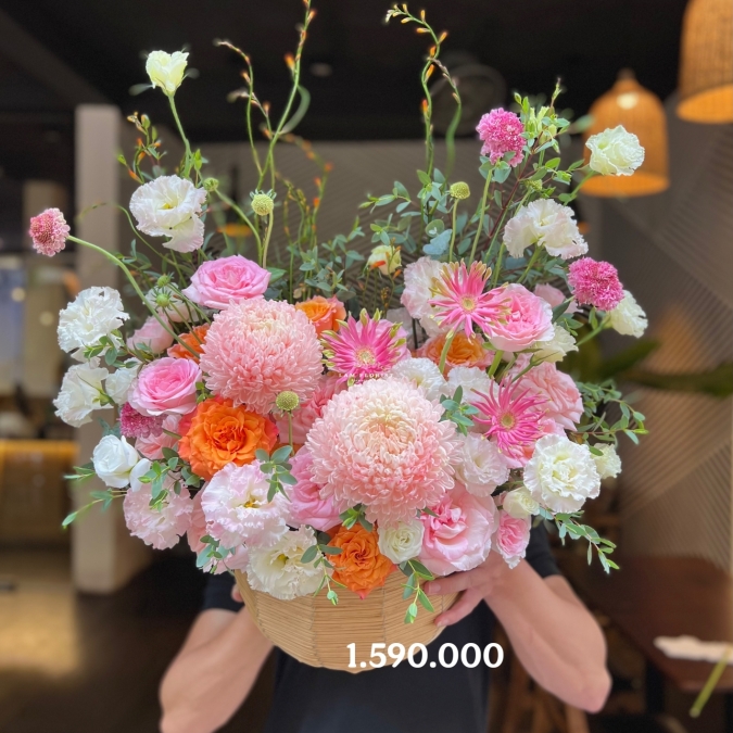 Hộp hoa được thiết kế với tông hồng – cam nhẹ nhàng, nổi bật với những bông cúc mẫu đơn hồng phấn to tròn, mềm mại; xen kẽ cát tường xoăn trắng – hồng dịu dàng và đồng tiền hồng ánh kem trẻ trung. Điểm nhấn sắc cam của vài bông hồng cam spirit giúp tổng thể thêm rực rỡ nhưng vẫn giữ được vẻ thanh thoát, sang trọng. Tất cả được sắp xếp hài hòa trong chiếc hộp mây đan tự nhiên, tạo cảm giác ấm áp và đầy nghệ thuật.
