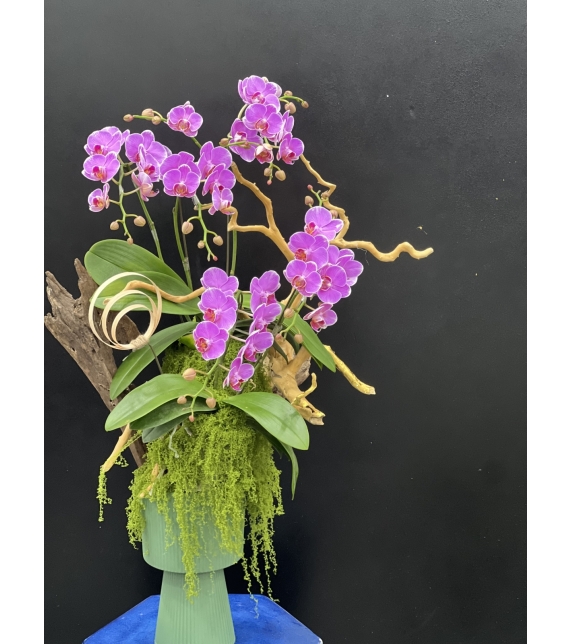 Chậu lan cao 80cm, ngang 40cm, được phối khéo léo giữa những cành lan hồ điệp tím rực, uốn lượn mềm mại trên nền rêu xanh mướt và gốc lũa tự nhiên, tạo nên tổng thể vừa sang trọng vừa gần gũi với thiên nhiên.