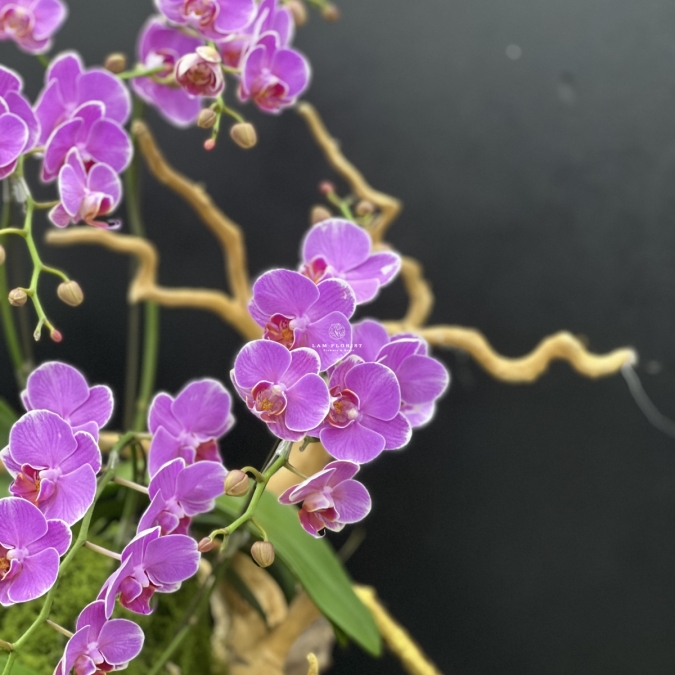 Chậu lan cao 80cm, ngang 40cm, được phối khéo léo giữa những cành lan hồ điệp tím rực, uốn lượn mềm mại trên nền rêu xanh mướt và gốc lũa tự nhiên, tạo nên tổng thể vừa sang trọng vừa gần gũi với thiên nhiên.