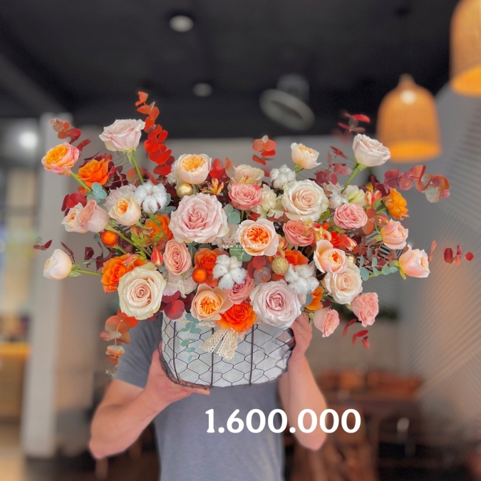 Giỏ hoa được thiết kế với tông cam – hồng thời thượng, nổi bật bởi những bông hồng Spirit căng đầy, phối cùng cát tường pastel và các cụm lá eucalyptus đỏ tạo chiều sâu tinh tế. Kiểu dáng lan tỏa sang trọng, mềm mại tựa như làn gió xuân, vừa ấm áp vừa cuốn hút. Tổng thể mang hơi thở hiện đại nhưng vẫn giữ được nét thanh nhã, phù hợp làm quà tặng cao cấp.