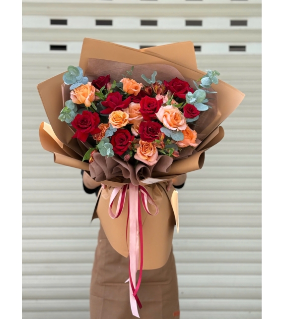 Sắc đỏ sâu lắng của hoa hồng tượng trưng cho tình yêu mãnh liệt, trong khi gam cam Simmer lại mang đến cảm giác ấm áp, rạng rỡ và đầy năng lượng tích cực. Lá bạc (eucalyptus) được điểm xuyết khéo léo, giúp tổng thể bó hoa thêm phần thanh lịch, cân bằng sắc màu và tôn lên vẻ hiện đại, tinh tế.
