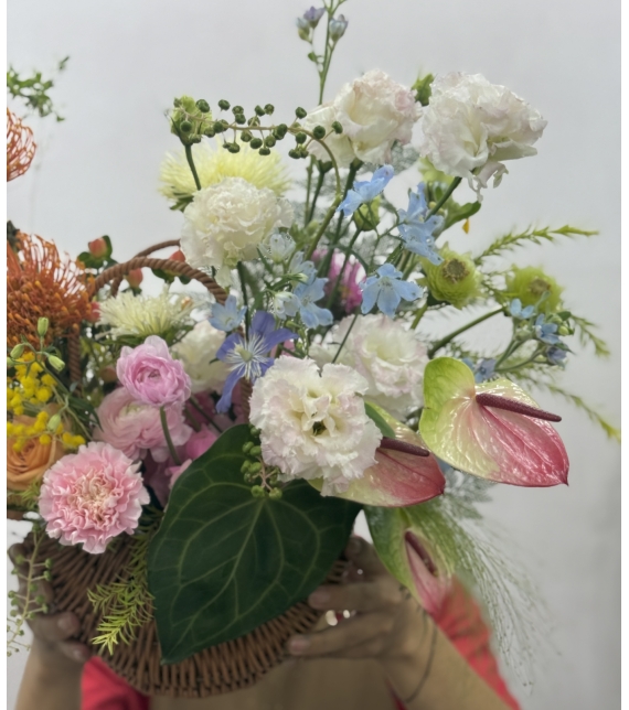 Sự kết hợp hài hòa giữa vàng rực của ranunculus và lan mokara, cam dịu của hồng Ecuador, xen lẫn hồng pastel, xanh baby và trắng tinh khôi tạo nên một bản giao hưởng màu sắc tinh tế nhưng không phô trương.