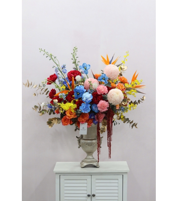 Vươn cao trong bố cục là thiên điểu – loài hoa của khát vọng và tự do, với dáng hoa mạnh mẽ, phóng khoáng, tạo chiều cao và nhịp điệu cho bình hoa. Hoàn thiện tác phẩm là lan vũ nữ rủ nhẹ, uyển chuyển, mang vẻ đẹp thanh thoát, sang trọng và chuyển động tinh tế.