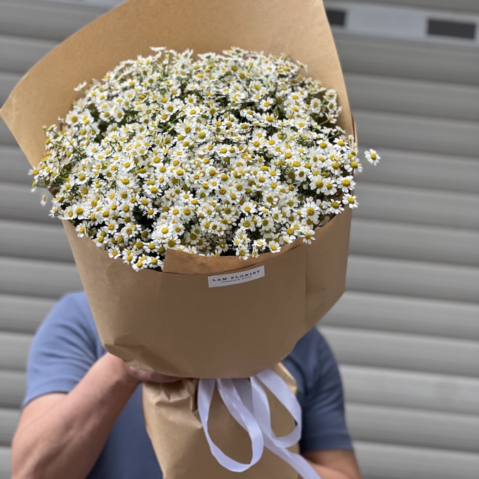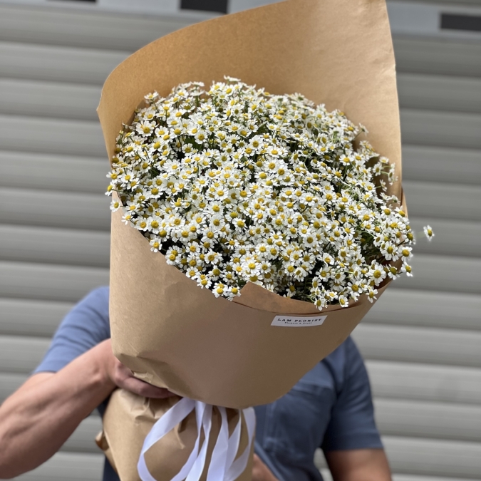 Những bông cúc Tana trắng nhỏ xinh, nở rộ trên nền lá xanh tươi mát, được gói trong giấy kraft hoặc giấy trắng tinh tế, kết hợp với nơ ruy băng nhẹ nhàng, tạo nên tổng thể thanh thoát, tươi tắn và đầy sức sống.