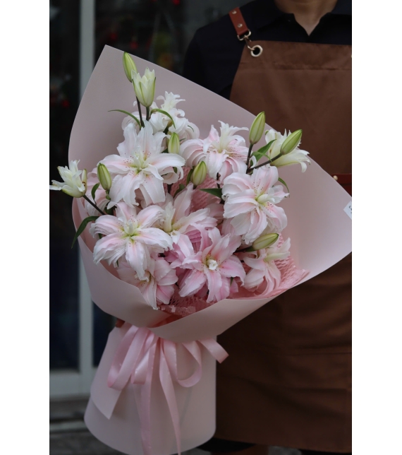 Bó hoa được thiết kế từ những bông ly kép hồng cao cấp – loài hoa nổi bật với số lượng cánh dày, xoè mềm mại như những lớp váy của một thiên thần nhỏ. Sắc hồng pastel nhẹ nhàng kết hợp với phần giấy gói đồng tông giúp tổng thể trở nên thanh thoát, sang trọng và vô cùng tinh tế.