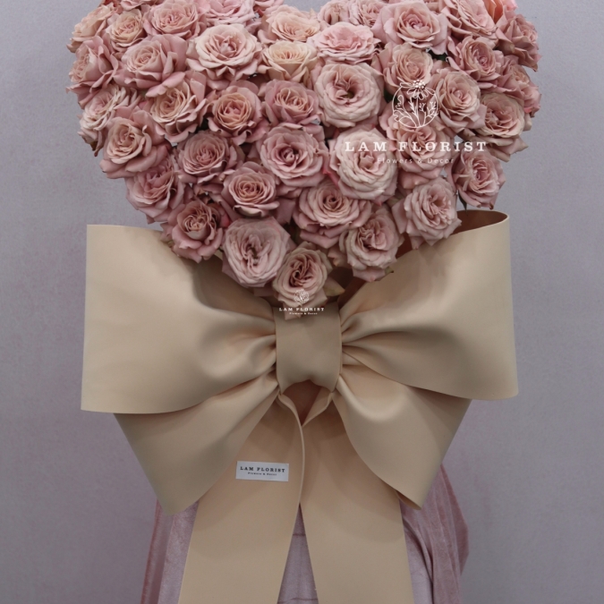 -Chậu hoa gồm 60 bông hồng Capuchino được kết thành hình trái tim đầy đặn. Những cánh hoa xoắn mềm, màu hồng beige thanh lịch tạo nên vẻ đẹp sang trọng nhưng vẫn nhẹ nhàng, lãng mạn. Tác phẩm được đặt trong chậu kèm nơ lớn màu kem, làm nổi bật sự tinh tế và đẳng cấp của tổng thể.