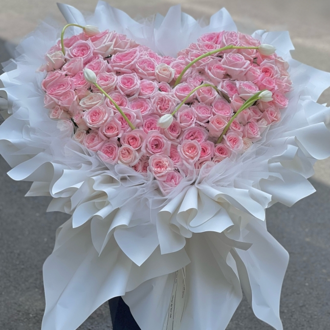 Bó hoa được thiết kế theo hình trái tim lớn, nổi bật với những đóa hồng phấn pastel mềm mại, xen kẽ một vài cành tulip trắng uốn cong nhẹ nhàng, tạo điểm nhấn thanh thoát và tinh tế. Lớp giấy gói trắng cao cấp được xếp bồng bềnh như những gợn sóng, ôm trọn phần hoa ở giữa, mang lại cảm giác vừa sang trọng vừa dịu dàng.