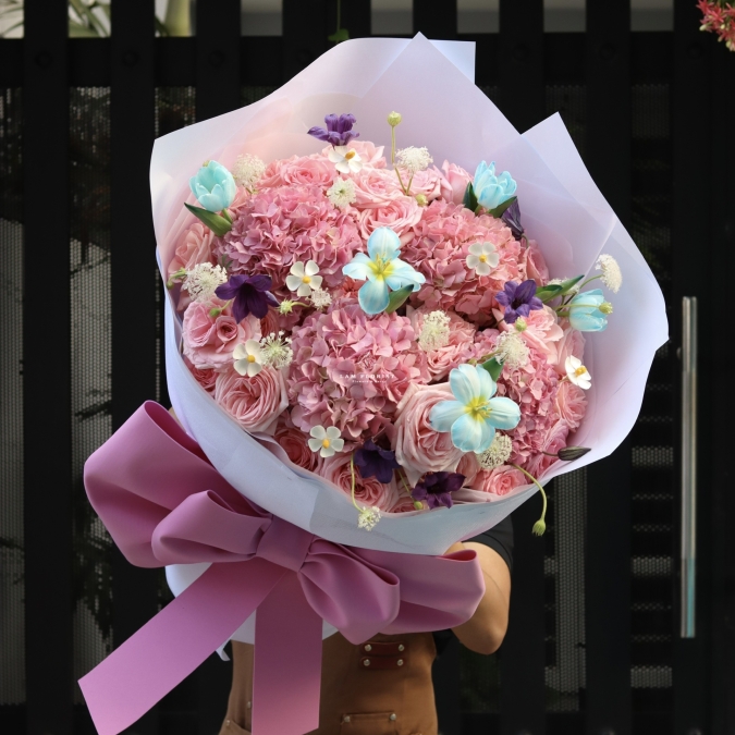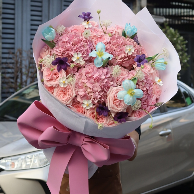 Các chi tiết hoa nhỏ nhiều màu được phối khéo léo tạo điểm nhấn tươi mới, giúp tổng thể không bị đơn điệu mà trở nên mềm mại, nghệ thuật hơn. Bó hoa được thiết kế dáng tròn lớn, form bung tự nhiên, kết hợp cùng lớp giấy gói trắng cao cấp và nơ hồng bản lớn, tạo cảm giác vừa ngọt ngào vừa “high-end”.