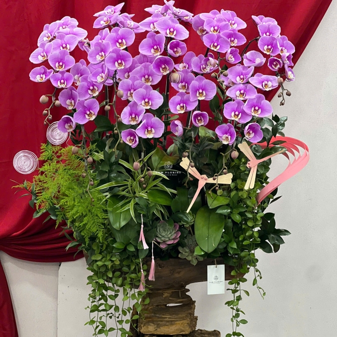 Chậu lan hồ điệp gây ấn tượng với gam màu tím hồng chủ đạo – biểu tượng của sự sang trọng và cuốn hút. Những cành lan được sắp xếp theo dáng tỏa rộng, uốn cong mềm mại, tạo cảm giác đầy đặn và giàu sức sống.