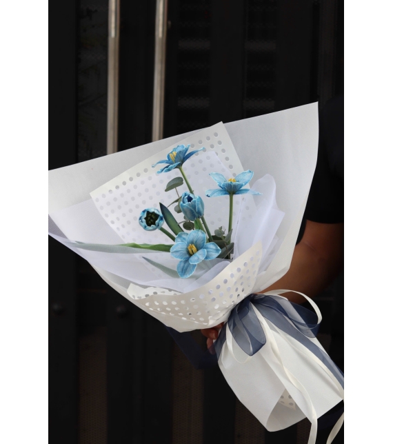 Bó hoa được gói trong giấy trắng cao cấp phối họa tiết chấm bi, kết hợp cùng ruy băng organza xanh – trắng thắt nơ tinh tế, tôn lên vẻ thuần khiết và thanh lịch. Tổng thể mang dáng vẻ nhẹ nhàng, sang trọng, phù hợp với nhiều phong cách từ hiện đại đến nghệ thuật.