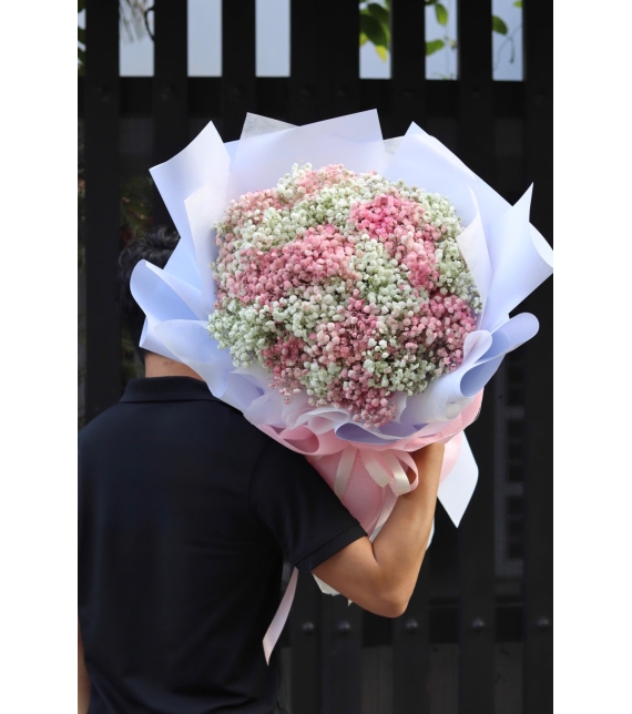 • Bó hoa được kết từ hàng ngàn cánh hoa baby trắng hồng nhỏ xinh, tạo nên tổng thể bồng bềnh như một áng mây mềm mại. Sự chuyển sắc tinh tế giữa trắng ngà thuần khiết và hồng phấn dịu nhẹ mang lại cảm giác nhẹ nhàng, trong trẻo nhưng vẫn đầy cuốn hút.