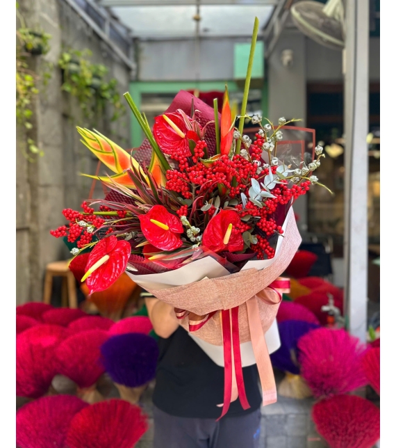 • Bó hoa bao gồm 5 cành đào đông, 2 cành cá chép, 5 hồng môn, mix hoa lá phụ
