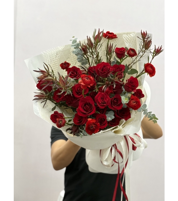 Bó hoa mang sắc đỏ quyền lực với hồng Ecuador đỏ Việt Nam kết hợp cùng mao lương đỏ nhập khẩu và lá Tulip đỏ Nam Phi, tạo nên tổng thể mạnh mẽ – cuốn hút – rực rỡ.