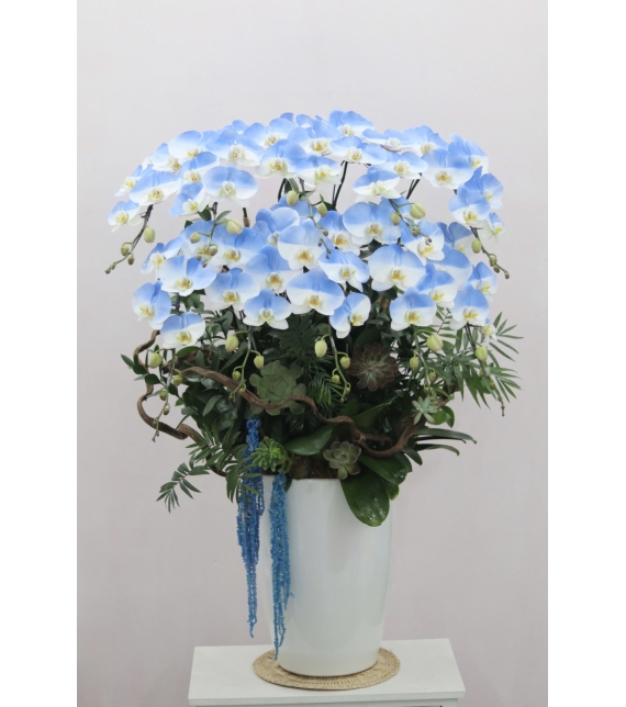 Dáng lan cao, tán hoa cân đối, từng cành uốn lượn mềm mại, vươn cao kiêu hãnh, tạo nên tổng thể bề thế – tinh tế – đậm chất nghệ thuật. Chậu lan cao 100cm, phù hợp trưng bày tại sảnh lớn, phòng khách sang trọng, văn phòng lãnh đạo, khách sạn, showroom hay không gian lễ nghi quan trọng.