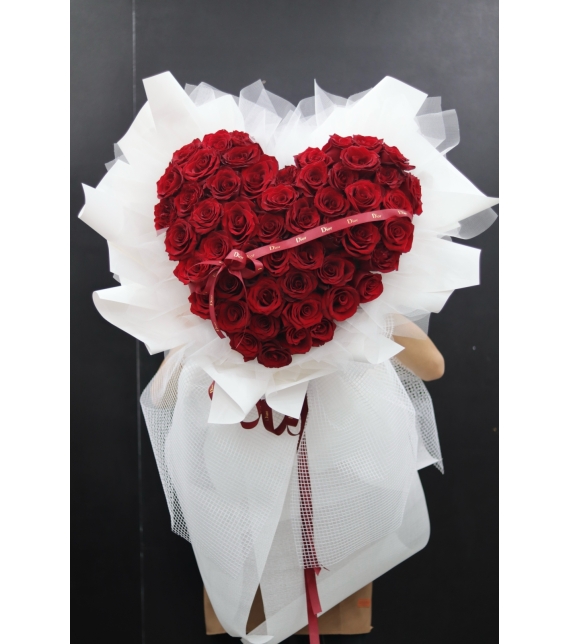 Từng bông hồng được cắm tỉ mỉ tạo hình trái tim 3D nổi bật, bao bọc bởi lớp giấy voan trắng tinh khôi và lưới cao cấp, làm nổi bật vẻ sang trọng và tinh tế. Chi tiết nơ lụa Dior đỏ burgundy là điểm nhấn đẳng cấp, thể hiện sự tinh tế trong từng đường nét.