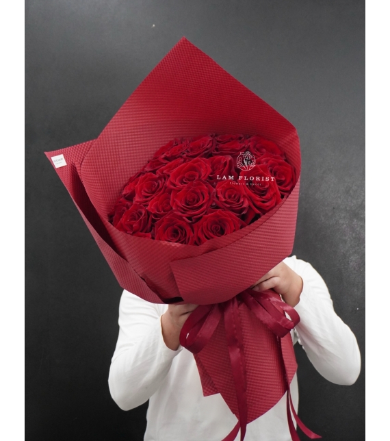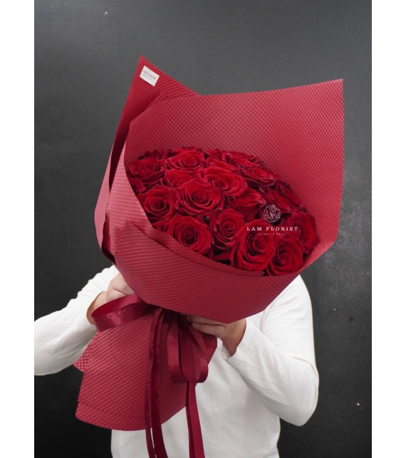 Bó hoa được thiết kế từ hoa hồng nhập khẩu Ecuador cao cấp, nổi bật với những cánh hoa lớn, mịn như nhung và sắc đỏ sâu quyến rũ.