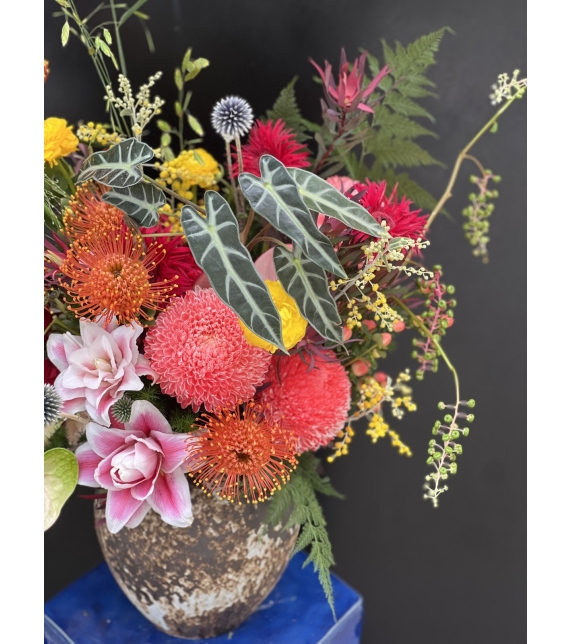 Từng loài hoa được cắm khéo léo theo tầng lớp, tạo chiều sâu và hiệu ứng thị giác đầy mê hoặc – vừa mạnh mẽ vừa uyển chuyển.