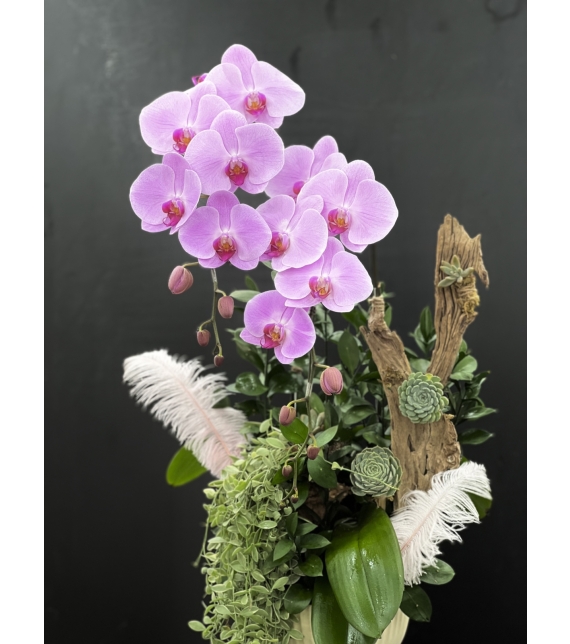 Chậu lan hồ điệp 2 cành mang sắc hồng tím dịu dàng, được phối cùng mảng xanh tự nhiên, điểm xuyết nhánh gỗ khô và cây sen đá tượng trưng cho sự bền vững và sinh khí dồi dào. Từng cánh lan mềm mại, e ấp như lời chúc cho may mắn, thành công và hạnh phúc viên mãn.