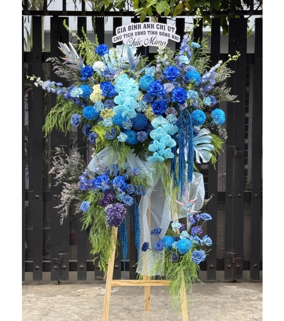 Thiết kế nổi bật với hoa hồng blue nhập khẩu, cúc mẫu đơn xanh, hoa hồng xịt xanh nghệ thuật, kết hợp cùng tú cầu xanh, lan hồ điệp xanh cao cấp và hệ lá nhập tạo nên tổng thể hài hòa, đẳng cấp và cực kỳ thu hút ánh nhìn.