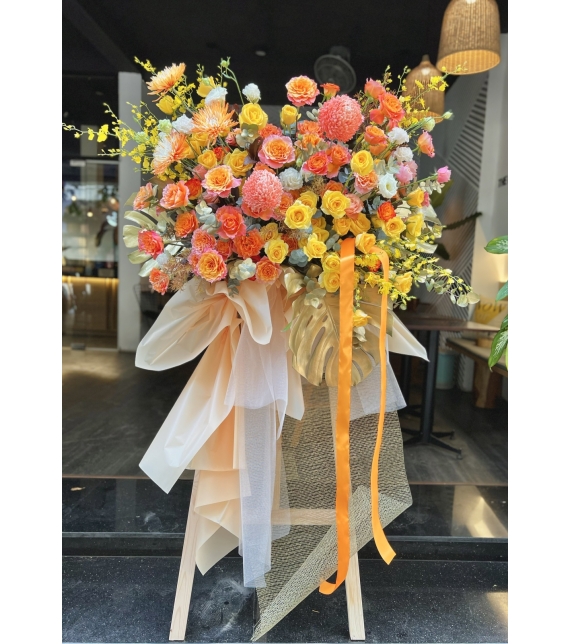 • Kệ hoa chúc mừng tone cam – vàng rực rỡ và quyền quý, nổi bật với hoa hồng cam Spirit đầy sức sống, cúc mẫu đơn đỏ cam tròn đầy phú quý, hòa quyện cùng hồng vàng sang trọng, lan vũ nữ vàng mềm mại và cát tường tinh tế.
