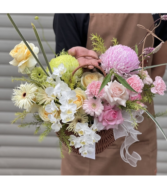 Giỏ hoa “Nắng Nhẹ Ngày Mới” được phối khéo léo với gam màu vàng pastel, hồng phấn và trắng tinh khôi — mang đến cảm giác ấm áp, an lành và dịu dàng như buổi sáng đầu ngày.