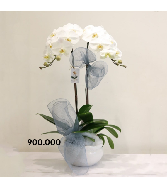 • Thiết kế lan hồ điệp trắng là biểu tượng của sự tinh khiết, sang trọng và thuần mỹ. Những cánh lan trắng mượt như lụa được sắp đặt trên phần gốc vững chãi, tạo nên bố cục vừa tối giản nhưng đầy khí chất. Mỗi cần hoa vươn lên mềm mại như dòng chảy của ánh sáng, mang lại cảm giác thanh thoát và tinh tế cho không gian.
