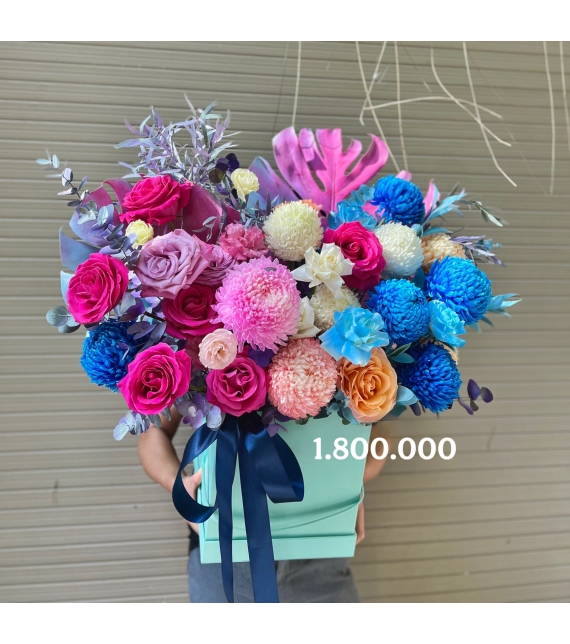 Hộp hoa nổi bật với sự kết hợp rực rỡ giữa cúc mẫu đơn đủ tông hồng – trắng – xanh, hoa hồng Pinkloy sang trọng, điểm xuyết các đóa hồng cam pastel và xanh nhuộm độc đáo. Tán lá bạc được xử lý xịt màu tím – hồng tạo chiều sâu và sự phá cách, làm tổng thể vừa hiện đại vừa nghệ thuật. Form hoa được cắm bung tỏa, tạo hiệu ứng thị giác đầy năng lượng và nổi bật.