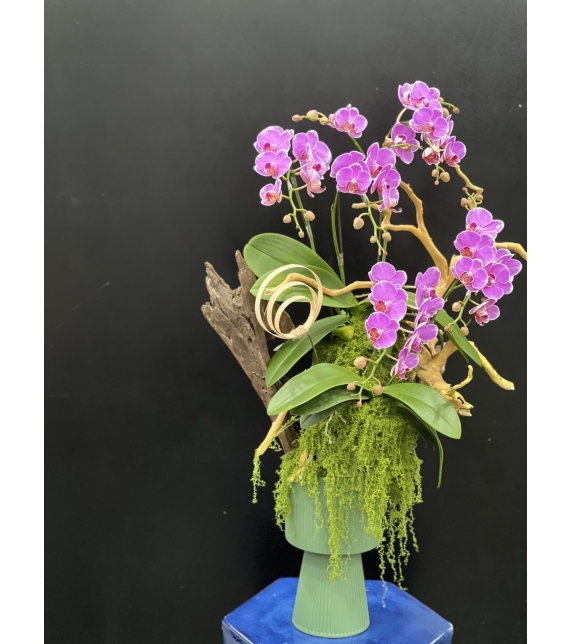 Chậu lan cao 80cm, ngang 40cm, được phối khéo léo giữa những cành lan hồ điệp tím rực, uốn lượn mềm mại trên nền rêu xanh mướt và gốc lũa tự nhiên, tạo nên tổng thể vừa sang trọng vừa gần gũi với thiên nhiên.