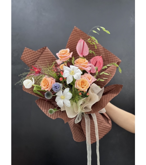 • Với khích thước bó hoa cao 45cm, ngang 35cm, được phối theo phong cách natural-modern với tông màu cam đào chủ đạo từ những cánh hồng kiêu sa, xen lẫn sắc trắng tinh khôi và hồng nhẹ nhàng. Điểm nhấn là chi tiết hoa cầu gai tím và lá xanh mềm mại, tạo nên tổng thể cân bằng giữa sự ngọt ngào và phóng khoáng.