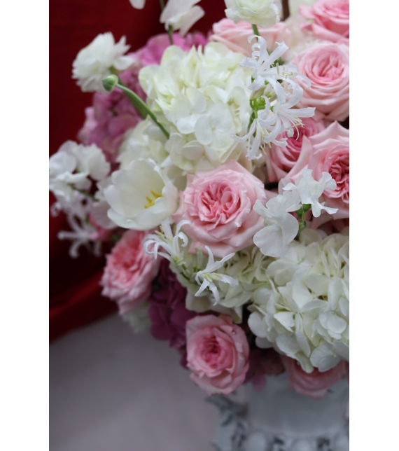 Sự hòa quyện tinh tế giữa tú cầu trắng, hoa hồng Ohara cao cấp, tulip trắng, đậu thơm trắng, bỉ ngạn cùng những điểm nhấn hoa hồng hồng phấn tạo nên tổng thể mềm mại, thanh lịch nhưng vẫn vô cùng sang trọng.
