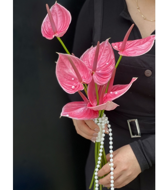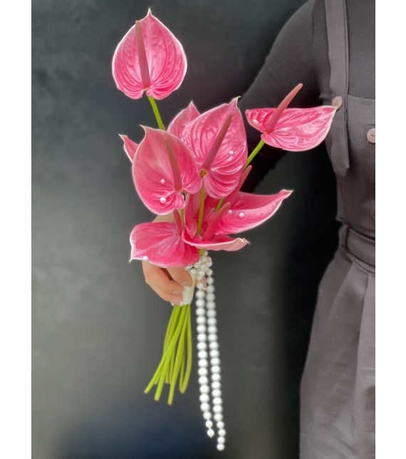 • Bó hoa cưới “Tình Ngọc” được kết từ 10 bông hồng môn hồng mềm mại, mang sắc hồng pastel thanh thoát và tinh tế.